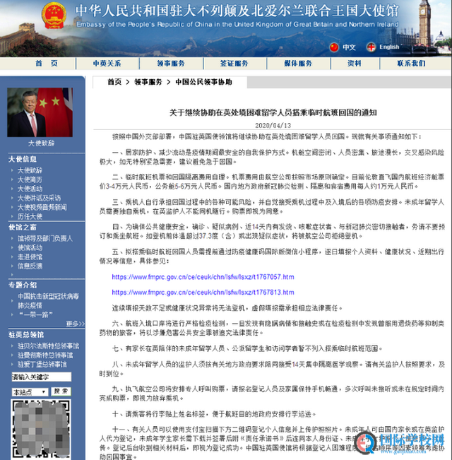 据报道,中国驻英国使领馆将继续协助在英处境困难留学人员回国,具体措施及费用相继公布,具体内容如下: