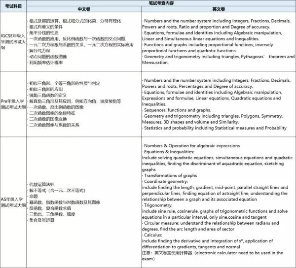 即将于15日举行校园开放日兼春招考试的科桥学院,给出了非常明确的数学考试范围。科桥的中英文数学卷,针对不同年级:IGCSE年级、Pre年级以及AS年级入学测试内容涉及的范围都比较广。