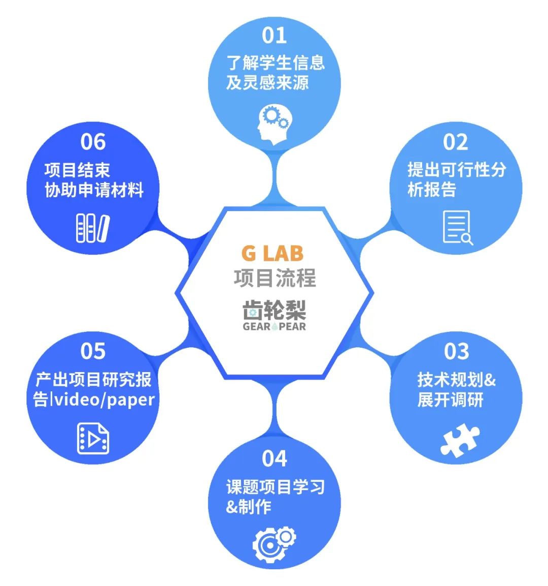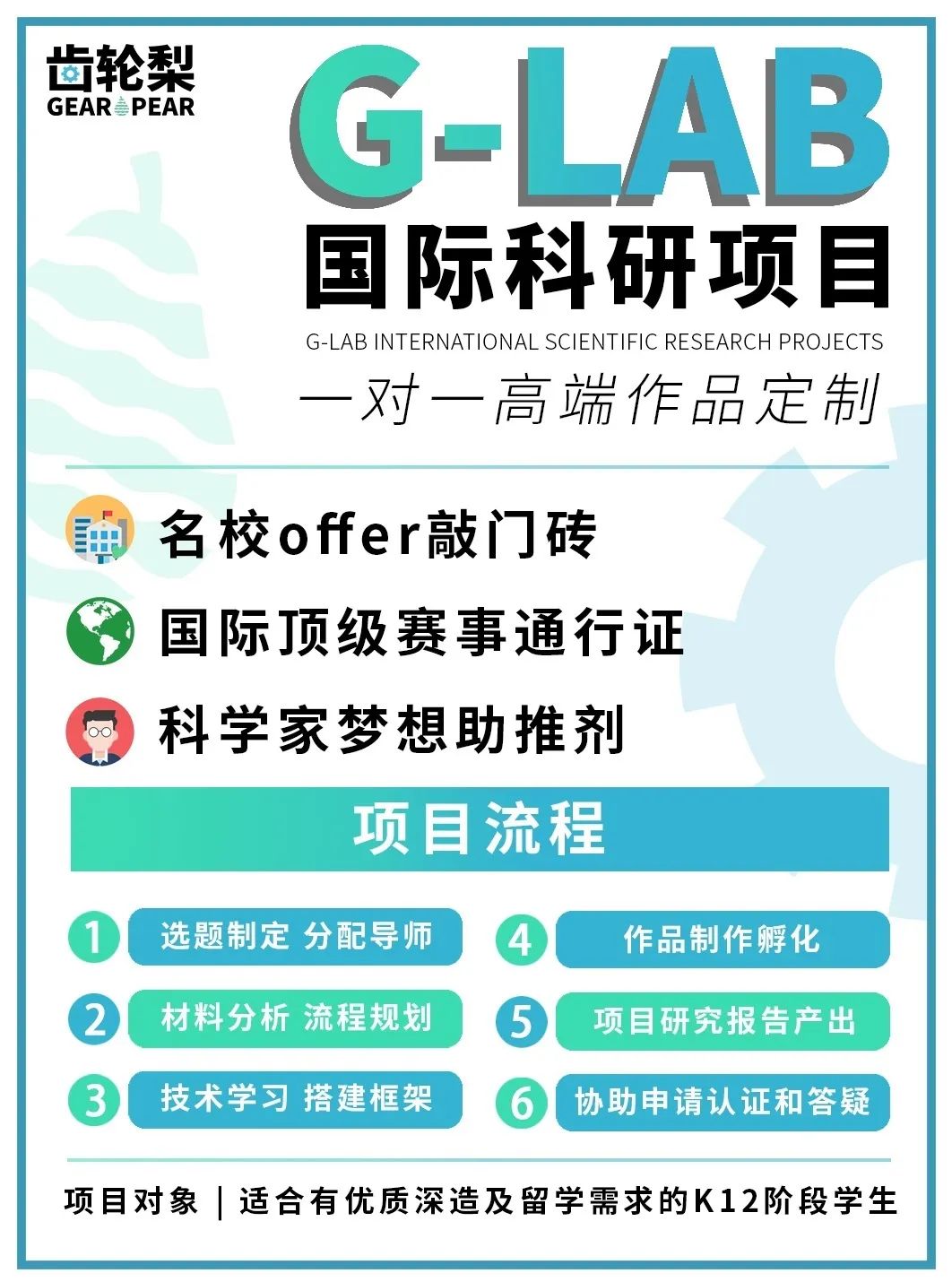 G-LAB项目流程在不久前的报道中介绍了齿轮梨创学院G-LAB国际科研项目已帮助多位学生完成自己的科创梦想并成功申请到心仪的学校,今天,我们就来看看获得全美TOP 1高中的学生的科创项目吧: