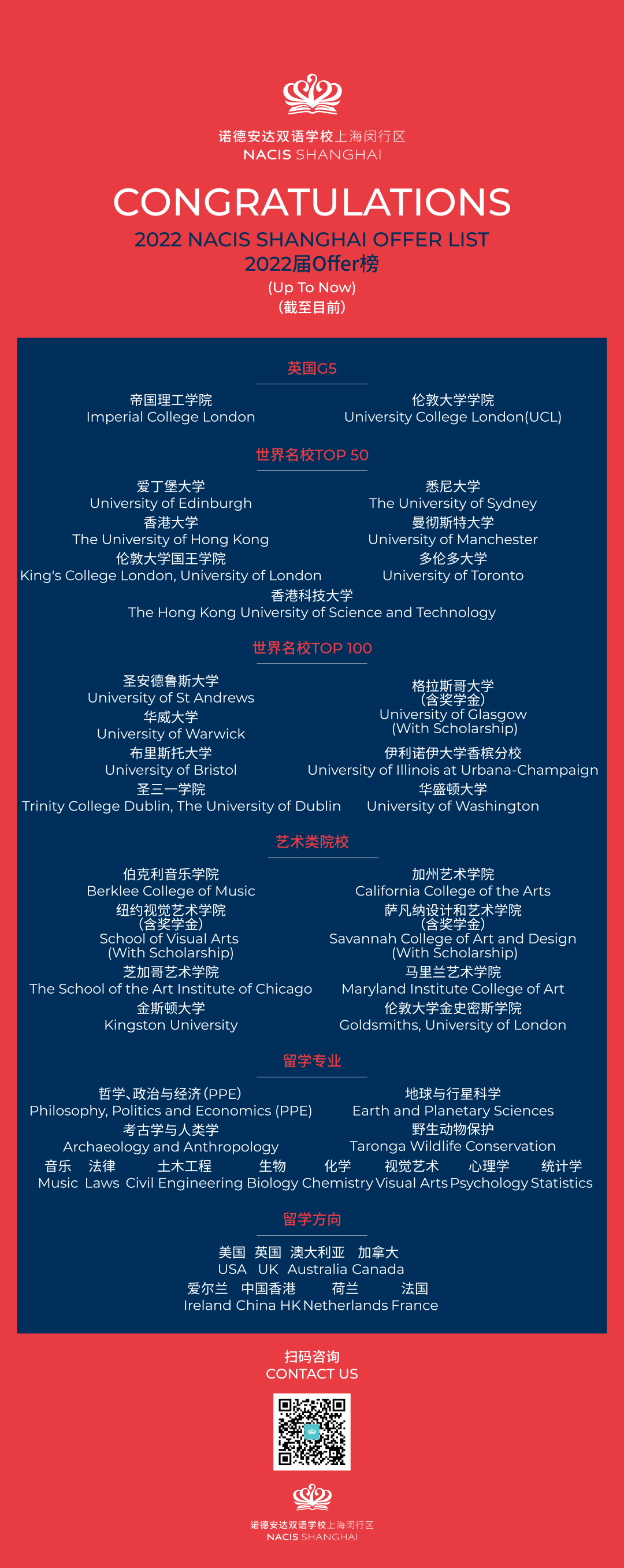 This year, 25 prospective graduates have received over 70 offers and a scholarship of RMB 400,000. As the first group of founding graduates, they have demonstrated the fruitful personalised learning achievements at NACIS Shanghai.
