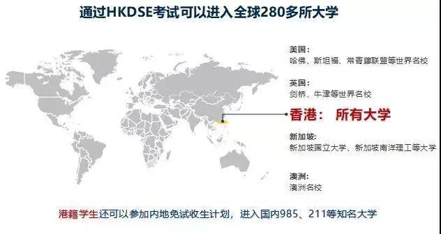 2012年开始,香港高考DSE允许内地籍考生报名参加,统一考卷,它也是全球唯一一个可以用中文答卷的国际考试,最终成绩可以升读香港以及海外名校,香港籍学生还可以免试招生入读内地211、985名牌大学。
