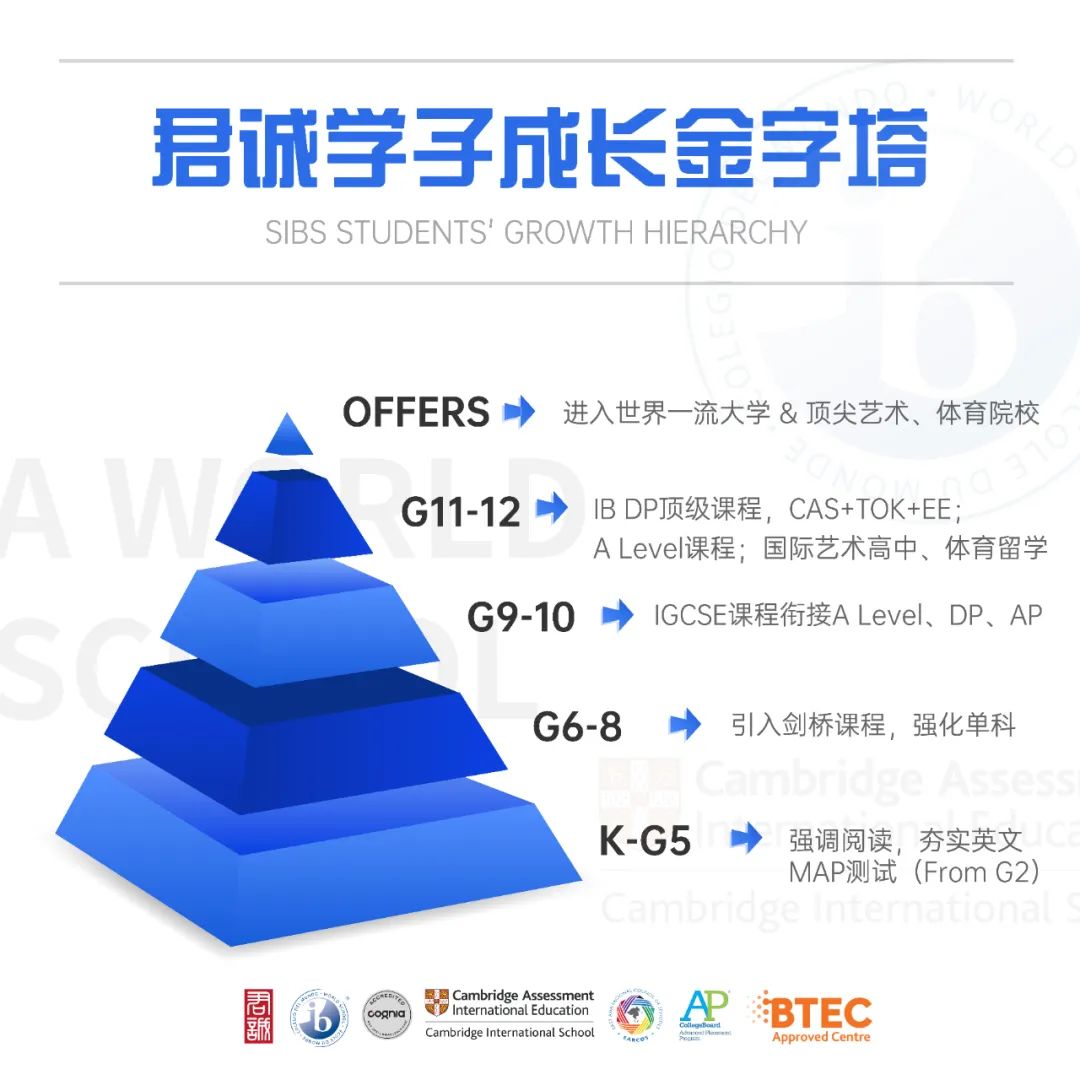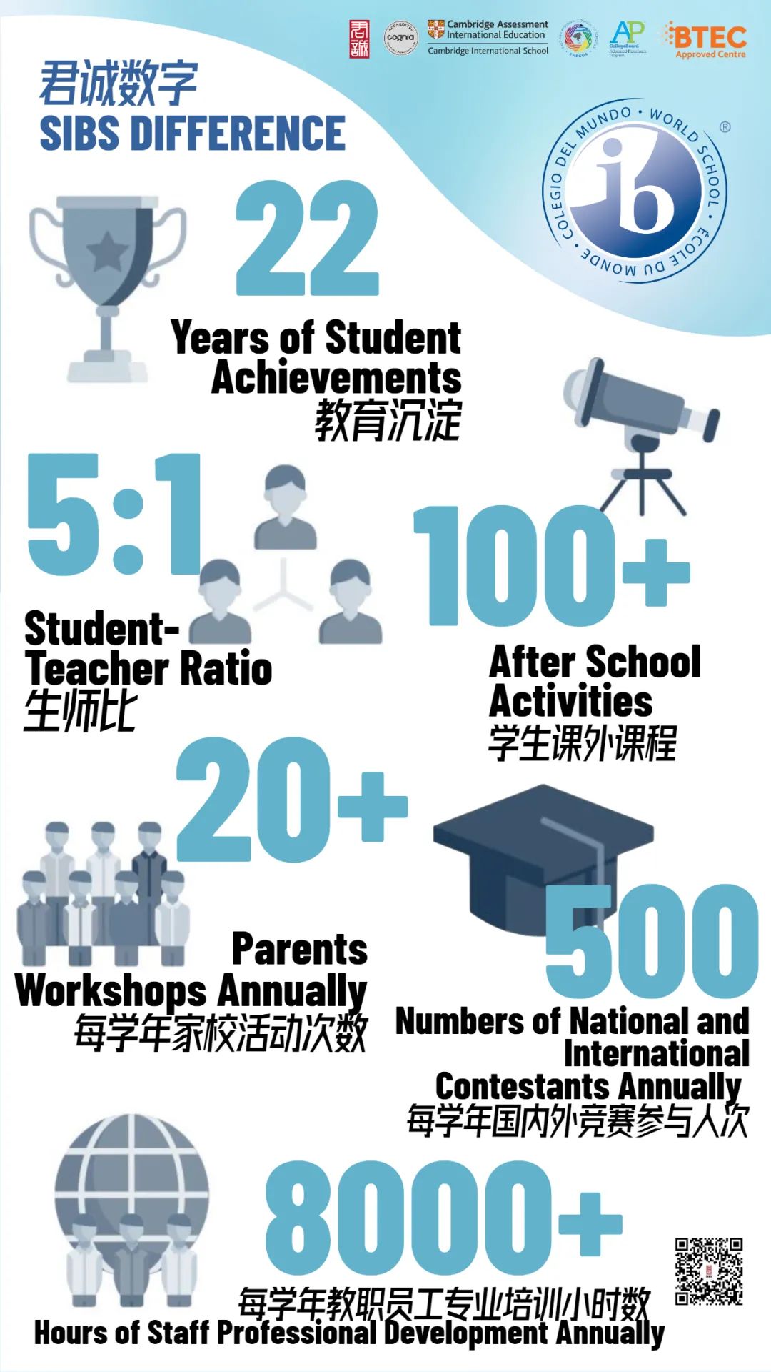 SIBS, founded in 2000, is dedicated to creating a multicultural learning atmosphere and high-quality international bilingual education which combined Chinese and western cultures for students aged 2-18. The school, consisting of three departments: a kindergarten, an elementary school, and a secondary school, is a boarding and day school. SIBS adopts small-size classes with English immersion teaching, the teacher-student ratio is 1:5, and foreign, Beijing residence and non-Beijing students can be enrolled across districts. 权威的国际认证是学术卓越的保障。君诚学校荣获国际文凭组织IBO的IB DP认证,拿到了“国际课程体系皇冠上最为耀眼的钻石”,真正成为了一所世界学校。与此同时,君诚已经拥有了剑桥国际课程CAIE认证、美国权威机构Cognia认证、东亚联盟学校EARCOS认证,美国大学理事会AP资质,以及英国BTEC体育项目授权。丰富的课程选择为君诚学子提供了进一步追求学术精进和冲刺世界名校的可能性。同时,君诚学校还提供校内外导师主导的课外课和丰富的国内外竞赛,以拓展学生视野,丰富学习体验,增强社群归属。 Authoritative international certification is the guarantee of academic excellence. SIBS has been authorized by the International Baccalaureate Organization IBO for IB DP in February 2021, obtained "the most dazzling diamond in the crown of the international curriculum system", truly becoming a world school. Before this, SIBS had already been authorized by Cambridge International School, accredited by American Authoritative Cognia Certification, approved by East Asia Alliance School Certification and AP qualifications from the American University Council. Diverse curriculums provide SIBS' students the possibility to achieve academic advancement and matriculate to world-renowned schools. At the same time, SIBS also provides many after-school activities teach by on- and off-campus teachers and domestic and international competitions to expand students’ vision, enrich their learning experience, and enhance their community affiliation.03君诚的课程体系是怎样的?