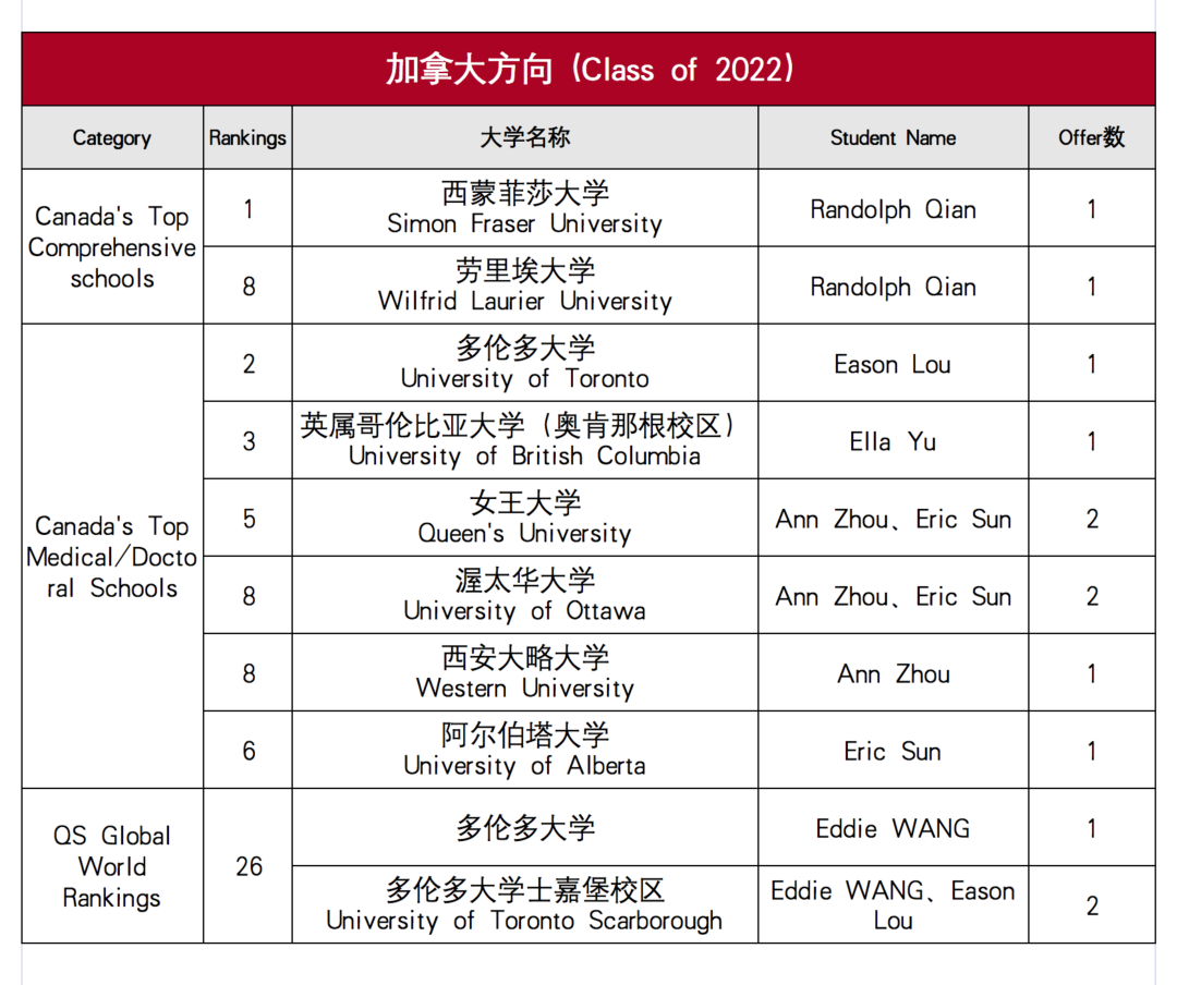 加拿大方向,收获多伦多大学、西蒙菲莎大学、劳里埃大学、英属哥伦比亚大学、女王大学、阿尔伯塔大学、渥太华大学等14封录取offer;