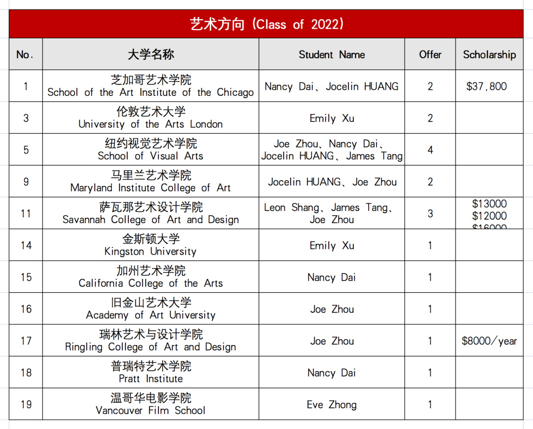艺术方向,收获伦敦艺术大学、芝加哥艺术学院、纽约视觉艺术学院、马里兰艺术学院、加州艺术学院、旧金山艺术大学、温哥华电影学院等19封录取offer;