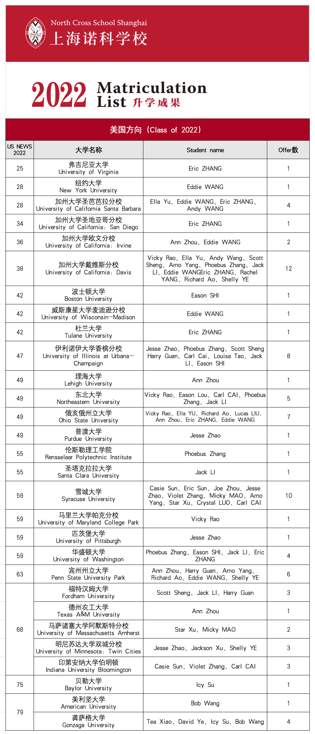 美国方向,收获弗吉尼亚大学、纽约大学、加州大学圣芭芭拉分校、加州大学圣地亚哥分校、加州大学欧文分校、加州大学戴维斯分校、波士顿大学、威斯康星大学麦迪逊分校、杜兰大学、伊利诺伊大学香槟分校、里海大学、东北大学、俄亥俄州立大学、普渡大学等179封录取offer;