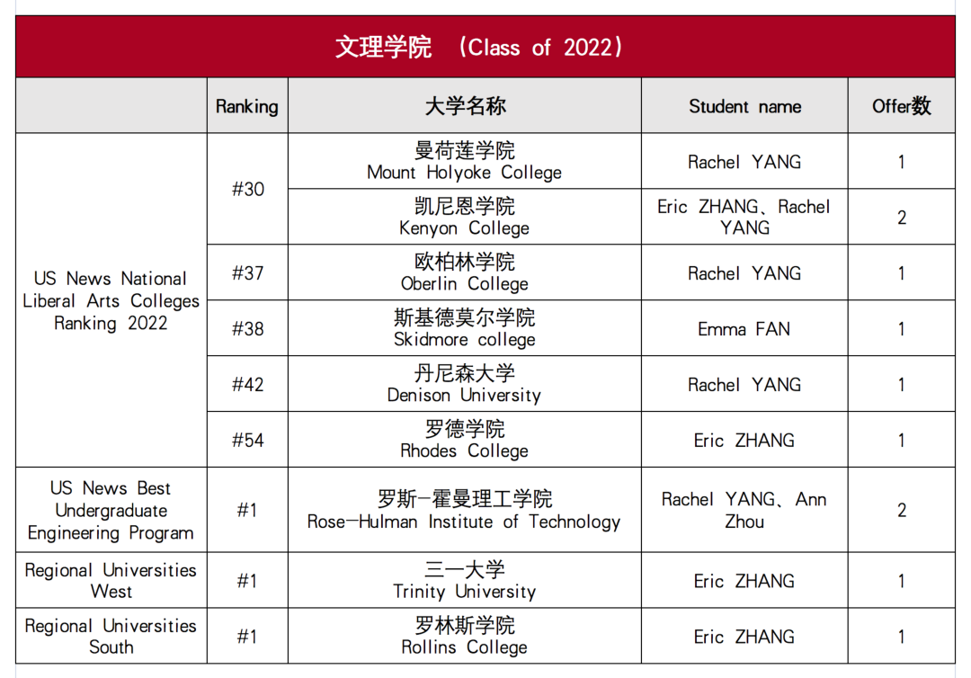 文理学院方向,收获曼荷莲学院、凯尼尔学院、罗斯-霍曼理工学院、三一大学、罗林斯学院等12封录取offer;