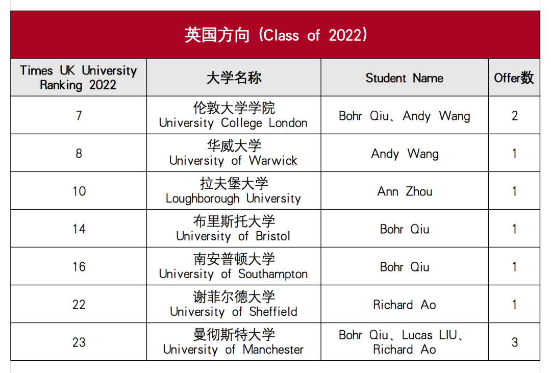 英国方向,收获伦敦大学学院、华威大学、拉夫堡大学、布里斯托大学、南安普顿大学、谢菲尔德大学、曼彻斯特大学等10封录取offer;