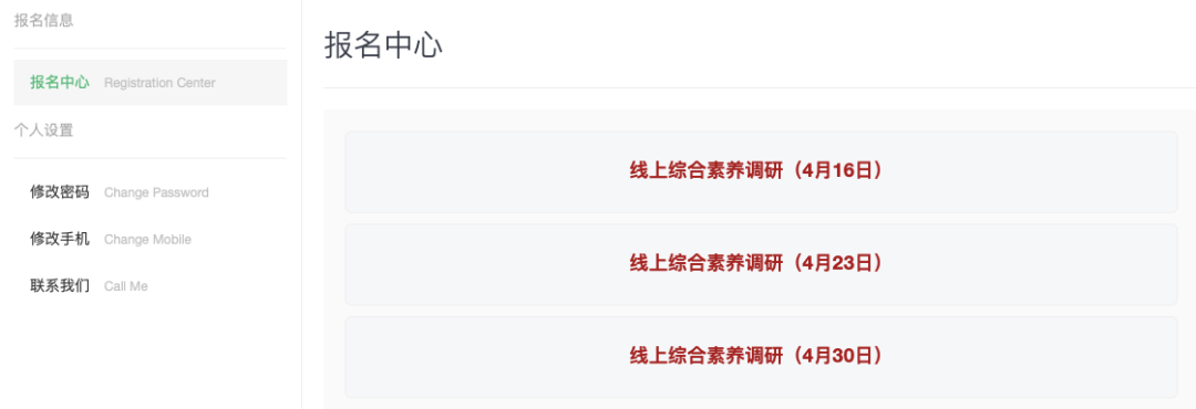 二、4月线上综合素养调研活动将分批次进行,主要在周六上午9:00-11:00。请有意报名参加活动的学生家长在报名中心里自行选择合适批次。