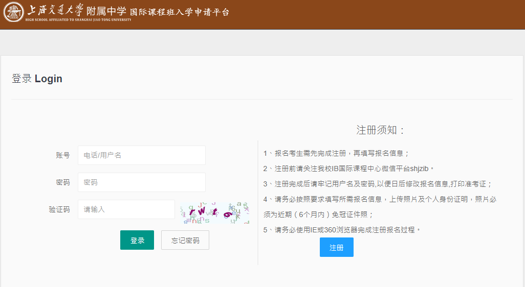 一、登录交中IB入学申请平台,新用户请先完成注册。已注册用户可直接登录。
