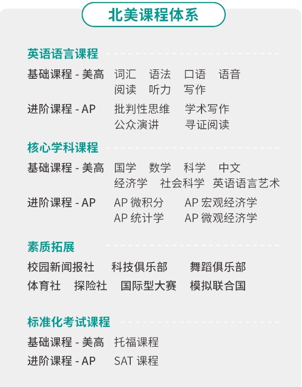 采用美国高中课程+AP课程相结合,在保持学校学科教学的优势基础上,以培养学生学术能力、领导能力、创新能力和独立思考能力为核心,探索多元化育人模式,为出国深造的学生提供优质的国际化教育资源及进入一流海外名校的通道