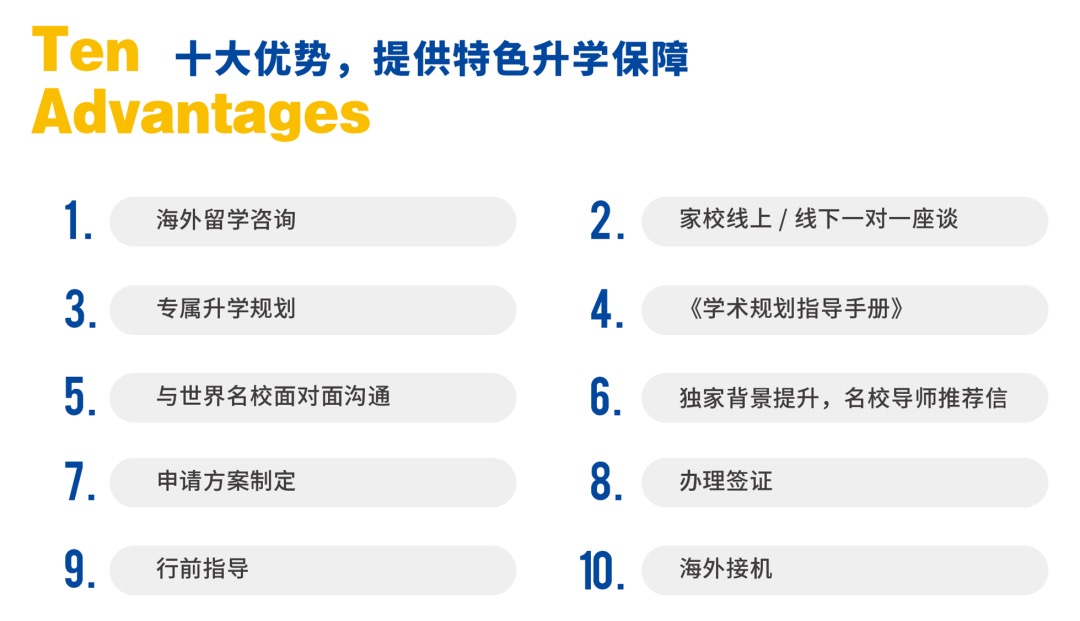 中育贝拉升学指导中心拥有专业的团队、严谨的流程和高效的服务体系。从9年级到12年级,为学生量身定制属于自己的升学计划,建立学生个人留学库并全程追踪。