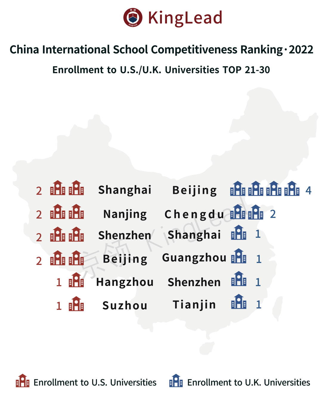 Among the top 21-30 international schools in the direction of Enrollment to U.S. Universities, Shanghai, Nanjing, Shenzhen and Beijing has the largest number of selected international schools , each with 2 schools being selected. Hangzhou and Chengdueach have 1 selected school.