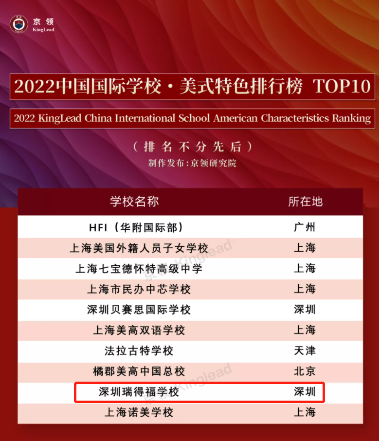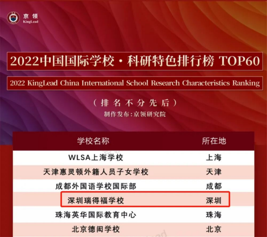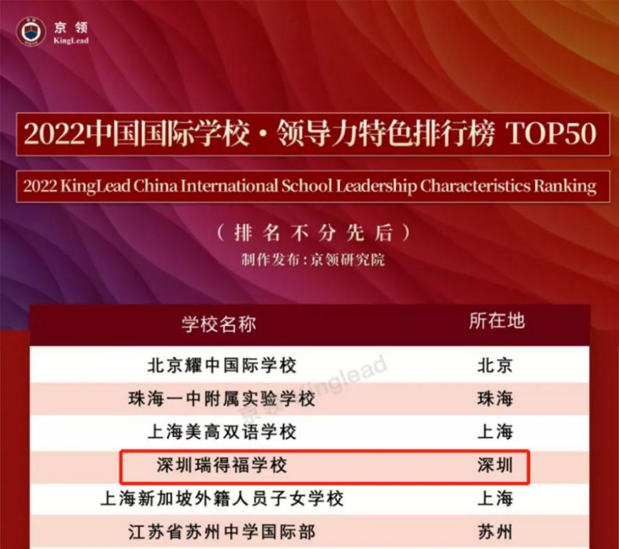 深圳瑞得福学校凭借一以贯之的美式菁英教育特质和稳步上升的综合实力,荣登京领排行榜中美式特色榜、领导力特色榜和科研特色榜!