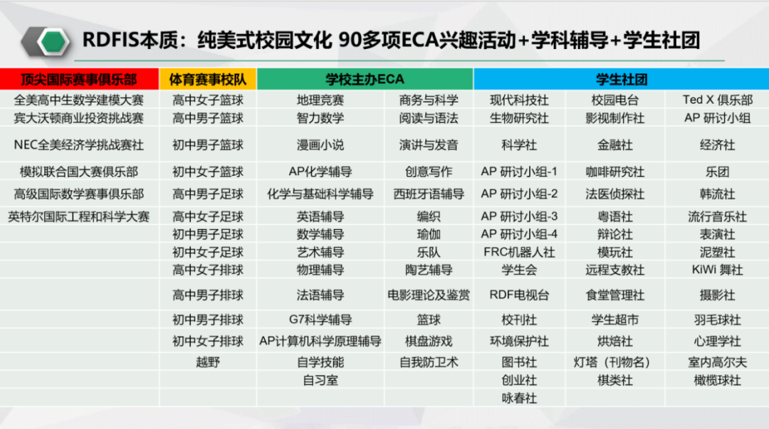 同时瑞得福国际学校在体育、智力开发、辩论演讲、社会调研、音乐美术、社交等各方面提供不同的资源和平台,组建社团、举办展览、比赛、演出,并设立多个奖项鼓励学生参与。