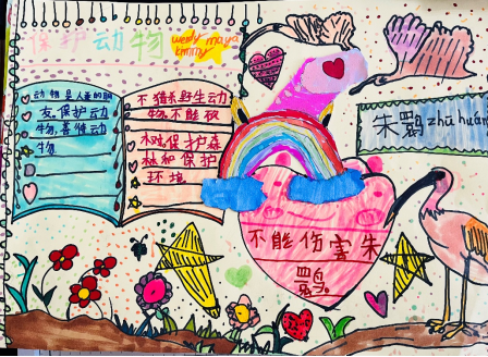 原来他们在做超学科单元:共享地球——生命体与他们栖息地的探究。在中英文老师的合作指导下,在这个单元中他们需要通过阅读、采访、亲身体会等方式来探索生命体的循环,生命体在自然界的生存方式以及我们如何和动物们和平相处。在总结评估阶段,他们需要完成一个小组作品——濒临灭绝动物生存手册。为了制作这个手册,他们需要通过各种方式去探索中国各地那些濒临灭绝的动物,了解它们目前的生存状况,基于他们对动物生存需求的理解,再制作出动物们的生存的手册。除了这个手册,孩子们还需要进行英文的信息类专题的写作, 他们写作的主题就是:How do they care for animal? 一年级的这次超学科主题探索,融合了美术、中文写作、中英文表达等各项学科技能,以及合作技能、研究技能等跨学科技能。
