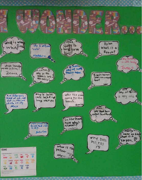你们知道每一次探究活动都从哪个环节开始吗?那就是提问,如同二年级墙上的这个Wonder Wall(问题墙)。它记录了孩子们在探索过程中提出的各种问题。