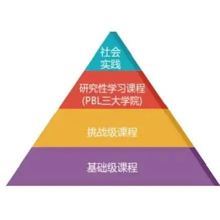 学习完基础课程后,学生们就进入挑战级课程的学习。挑战级课程包括美国大学先修课程AP、A-Level、IB课程,学生在高二的时候可以自主选择,也可以在全国各个学校间走校。接下来,学生学完挑战级课程之后,将进入第三级的项目式学习中。三大科学学院承载着各种各样的项目式学习内容和还有社团。学生把所学的跨学科知识,主动给应用到项目中去解决问题。