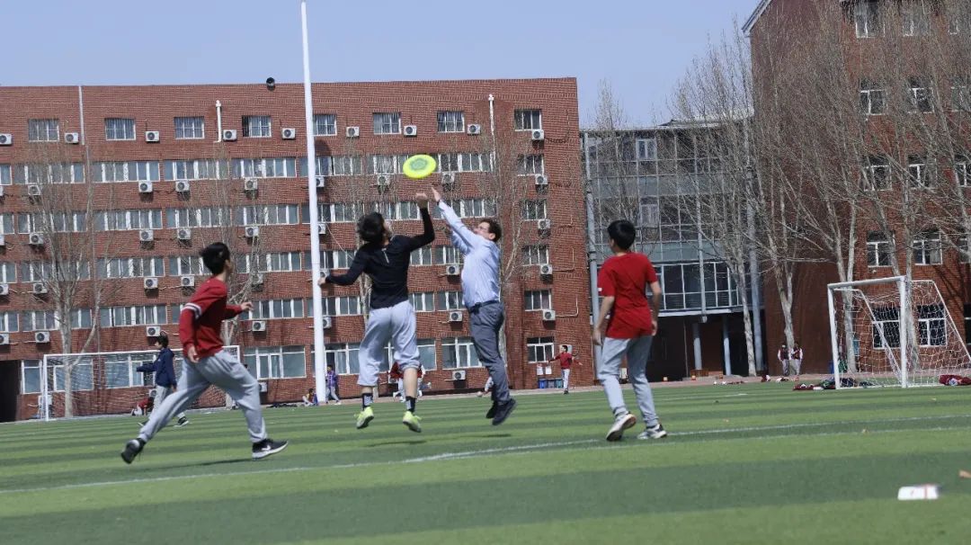 休息时间,如果你路过操场就可以看到奔跑在操场上的学生们和外籍教练,有针对足球的英国教练,还有传授飞盘经验的美国教练,通过有序的训练和实战,学生们在技术和策略方面都有了较大提升。