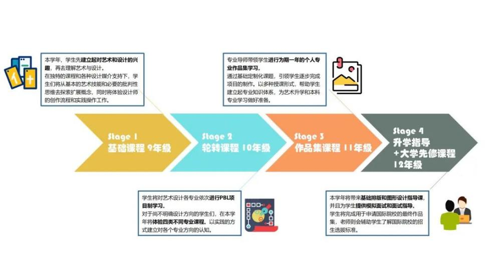 IAC是诺恩艺术中心的核心课程体系,分别植入4个学年分阶段完成,由:基础课程、轮转课程、作品集制作课程、升学辅导课程四部分组成,循序渐进,在每个阶段结课后均有任务完成,保障学生最终选择到最合适的艺术专业方向。在学制的最后一年,还会融入海外艺术大学先修课程,帮助学生在出国前提前适应海外的课程教学体系内容。