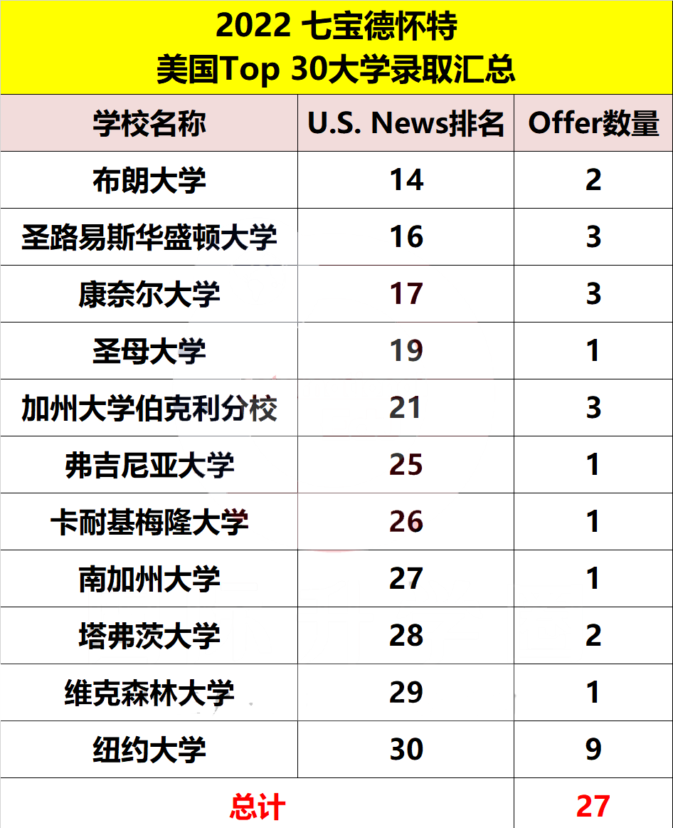 七宝德怀特今年共斩获27枚Offer,同上中国际并列第6名,较去年下降11枚。