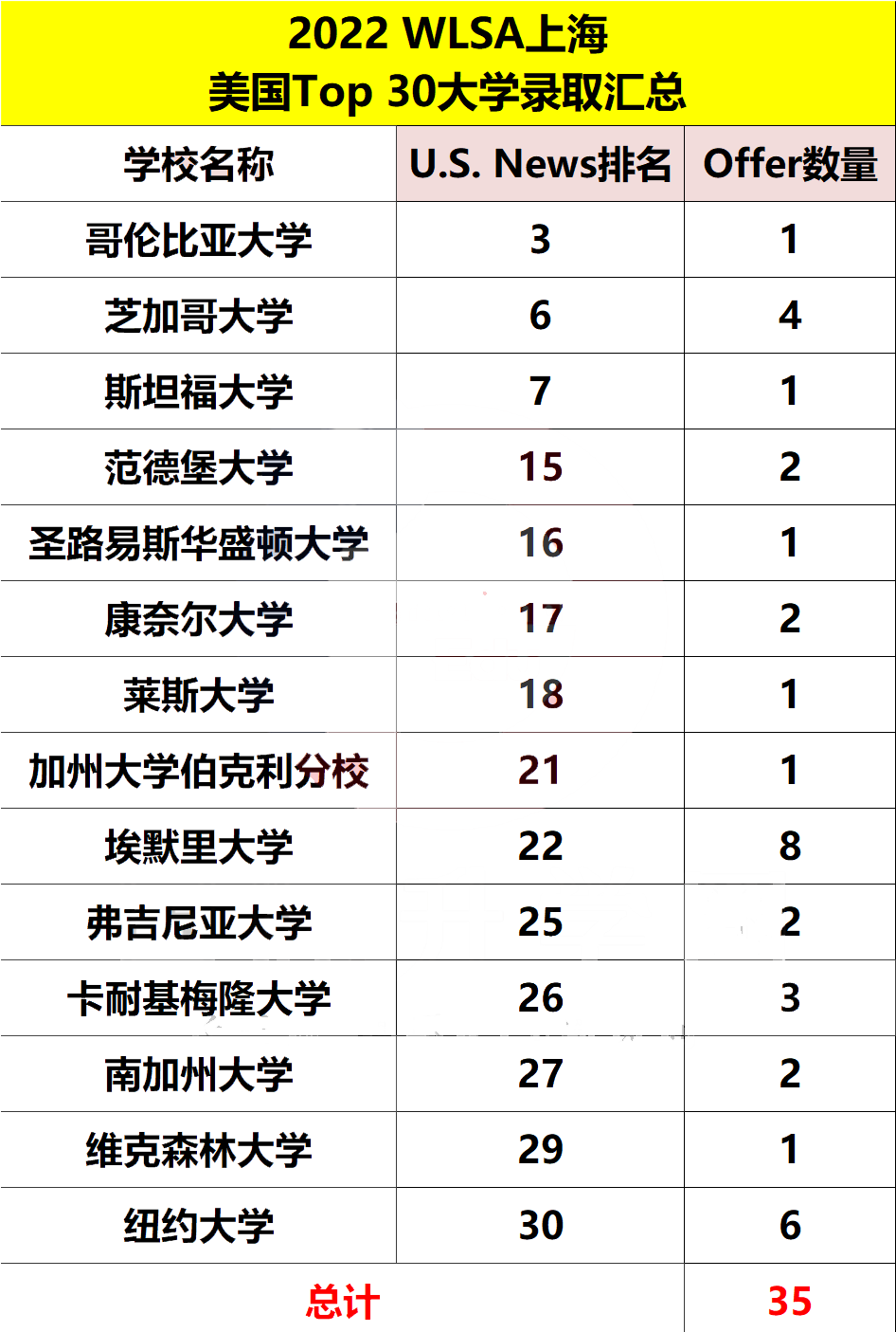 作为上海第一所哈耶普斯麻大满贯的学校,WLSA上海今年的成绩和去年相差无几,涨幅并不高,共拿到了35枚Offer。