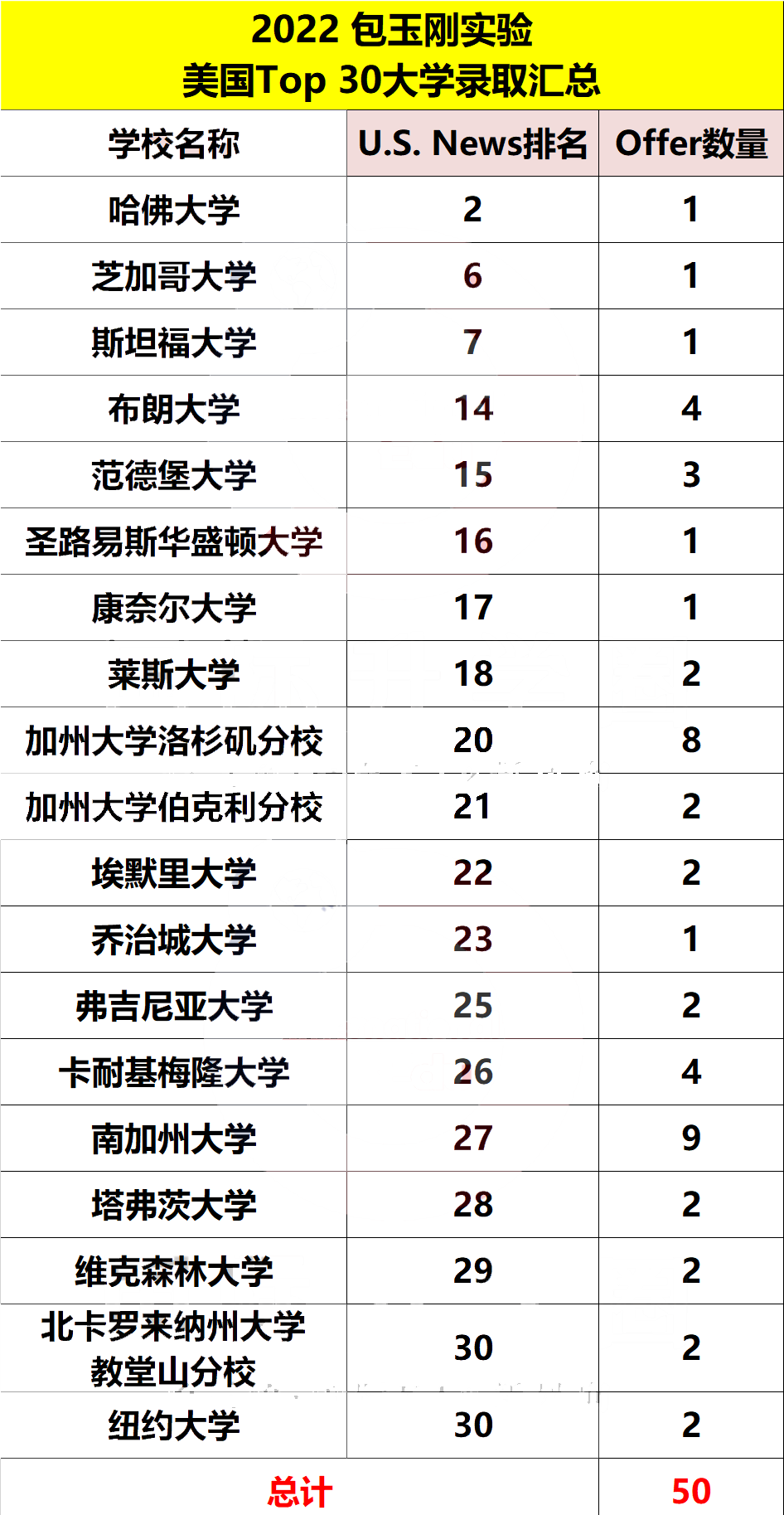 老牌名校包玉刚实验,今年共计拿到了50枚Offer,覆盖了19所美国大学,排行上海第三名。