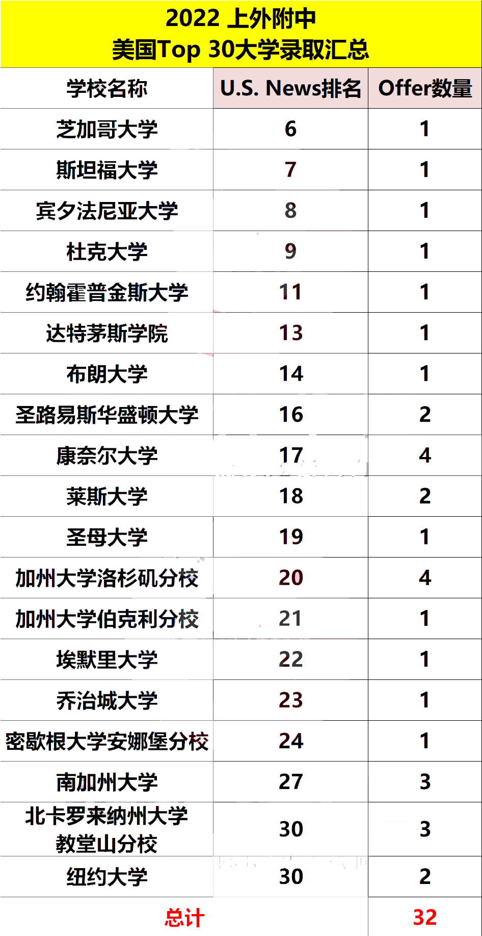 上外附中今年共拿到了35枚Top 30大学的Offer,位于第五名;
