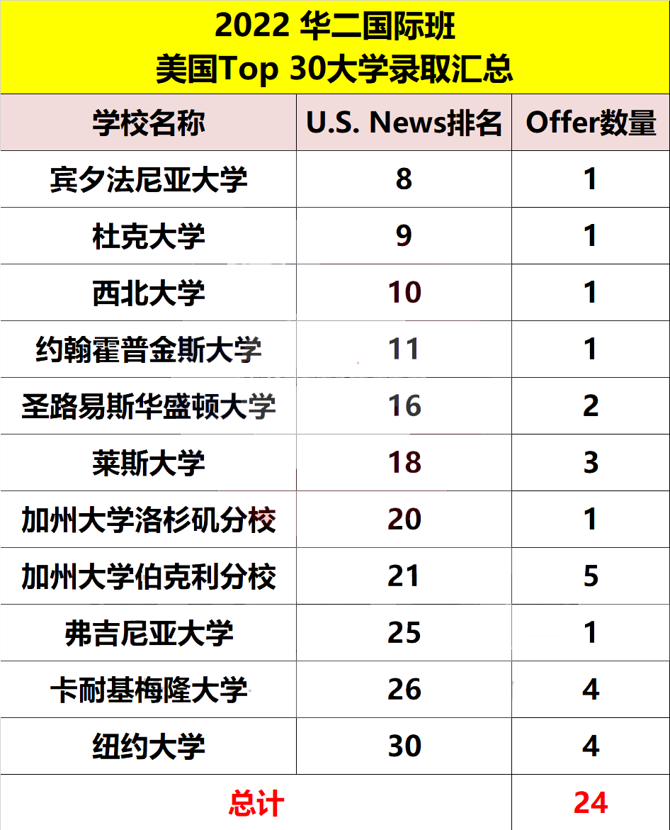 华二国际班今年的总成绩不敌去年,少了23枚,下降比例同样有50%左右,以24枚Offer的成绩位居沪上第八名。