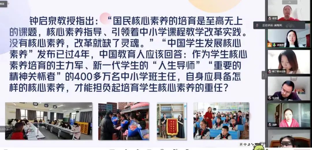 培训中,诸书记用一个个生动的案例,诠释着我校班主任对核心素养的践行,课件中的每一张图,都是班主任工作的缩影。这次培训,也让我充分感受到了:好的教育不是铁器的敲打,而是水的软磨,将坚硬的石头凿穿、将粗糙的石块打磨成美丽的鹅卵石。遇到学生问题,只有爱心和责任心是不够的,还要讲求方法,每一个学生都是不同的个体,所以在处理问题时所采用的方法也不尽相同。比我优秀的班主任案例有许多,他们对学生的爱远远胜于我,我看到了自己工作的不足,今后在工作中要从小事做起,教育学生讲究方法,注重策略,继续努力学习,做一个快乐的教师。