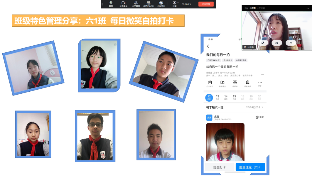 “每日一拍”是我们六1班共同制定的一项小活动,此活动的目的是希望孩子们能够在洗漱之后给自己一个微笑,开启美好的一天,在穿戴好校服红领巾之后,自拍并上传,老师也能及时发现,有没有睡过头的同学,有没有踩着点上早读的同学。孩子们用满满的仪式感,开启一天的网课。且此活动不强制,孩子们自主参与,从一开始的十几人,到现在的二十几人,参与度在不断提高,拍照的质量更是令人欣喜,学生的状态越发积极。