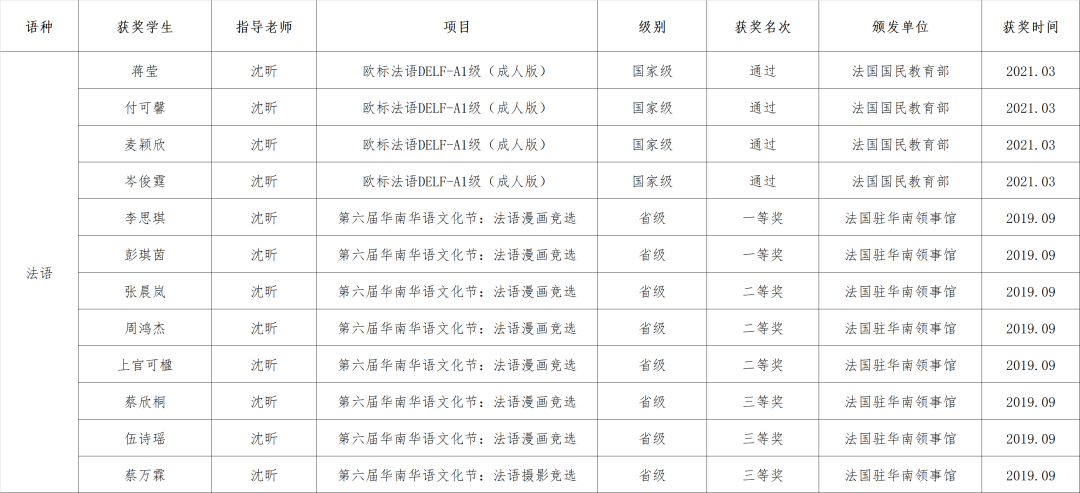 2017年在学校领导和教师的带领下,法英复语班的学生赴法国巴黎圣马丁学校进行研学活动;2018年在广州法国领事馆的支持下我校成功承办了“华南法语文化节”;2019年至今,积极组织法语班学生参加校内各类活动的多语种主持、法国领事馆的法语漫画绘制和摄影主题竞赛、校内多语种朗诵比赛和演讲大赛,均取得佳绩,学生们在丰富多彩的活动中提升了语言能力和自信心!