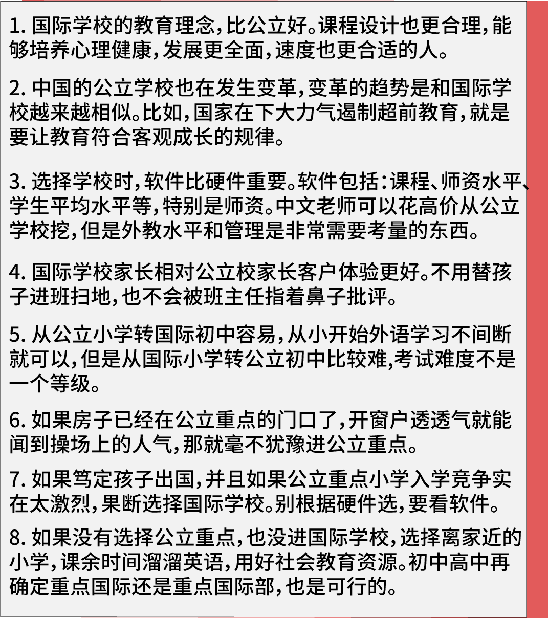 考虑到上面的种种因素,小编对于选择公立还是国际的看法如下: