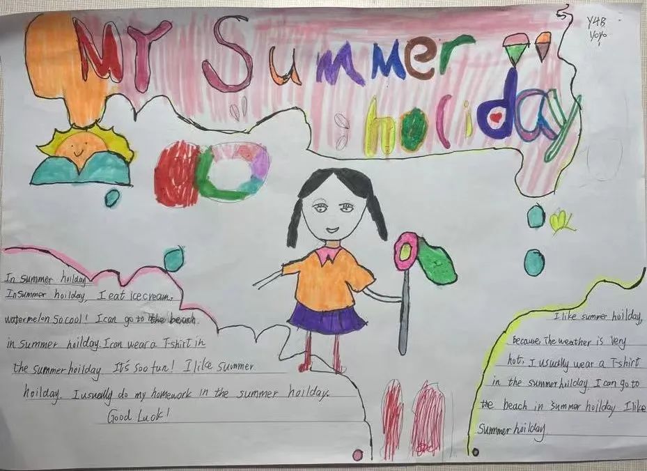 “我的这份小报的名字叫做《我的夏天》。夏天是我最爱的季节,疫情前,我和爸爸妈妈经常去出海度假。蓝蓝的大海,金黄的沙滩,我还画了游艇,草坪,蝴蝶和饮料店。每次带着我的行李和美好的心情,开开心心享受夏天带来的快乐。感谢老师和同学们喜欢我的作品。希望疫情尽快结束,与家人一起再度夏天假期!”
