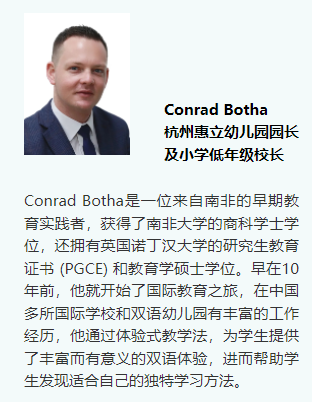 越来越多的家长关注到了幼升小的衔接问题。家长更多关注的是择校,而学校则更偏向于学生的内心建设,Conrad Botha就以杭州惠立为例,介绍了他们在幼小衔接中获得的经验:“在惠立,我们将小学一年级视为幼儿园教学的继续或延伸,因此帮助孩子顺利过渡是每个参与孩子学习、生活的成年人的职责。这就意味着,家长、老师和学校应该作为一个整体,互相协作,实现教育衔接。”