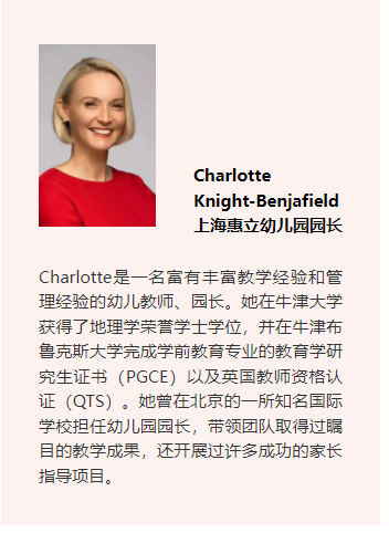 至于家长时常担心的生活问题,Charlotte认为有几个关键点,其一是“可以在日常生活中鼓励孩子进行同龄人之间的社交,帮助他们建立自信心,从而自如地面对幼儿园中的社交关系。”其二是“建立独立性”,“根据年龄特点,独立如厕、穿衣、洗手等,都可以在入园前学习锻炼。”