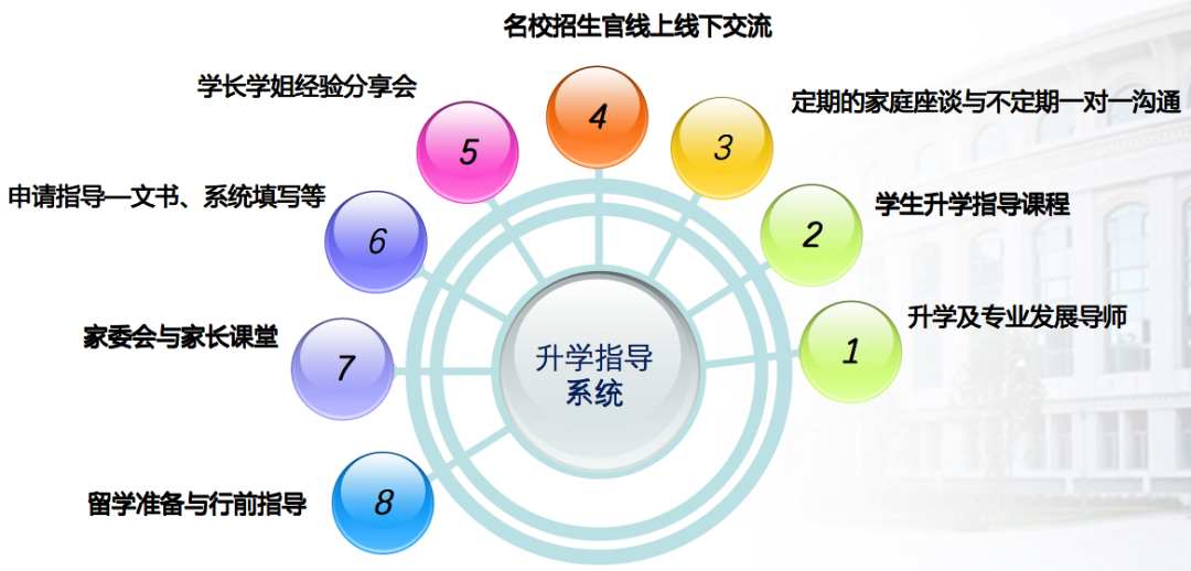 同时学校设立专门的升学指导办公室,帮助学生进行高中学业规划、标准化考试准备、课外活动准备以及大学申请、职业规划,系统的升学指导将贯穿学生三年高中生活。