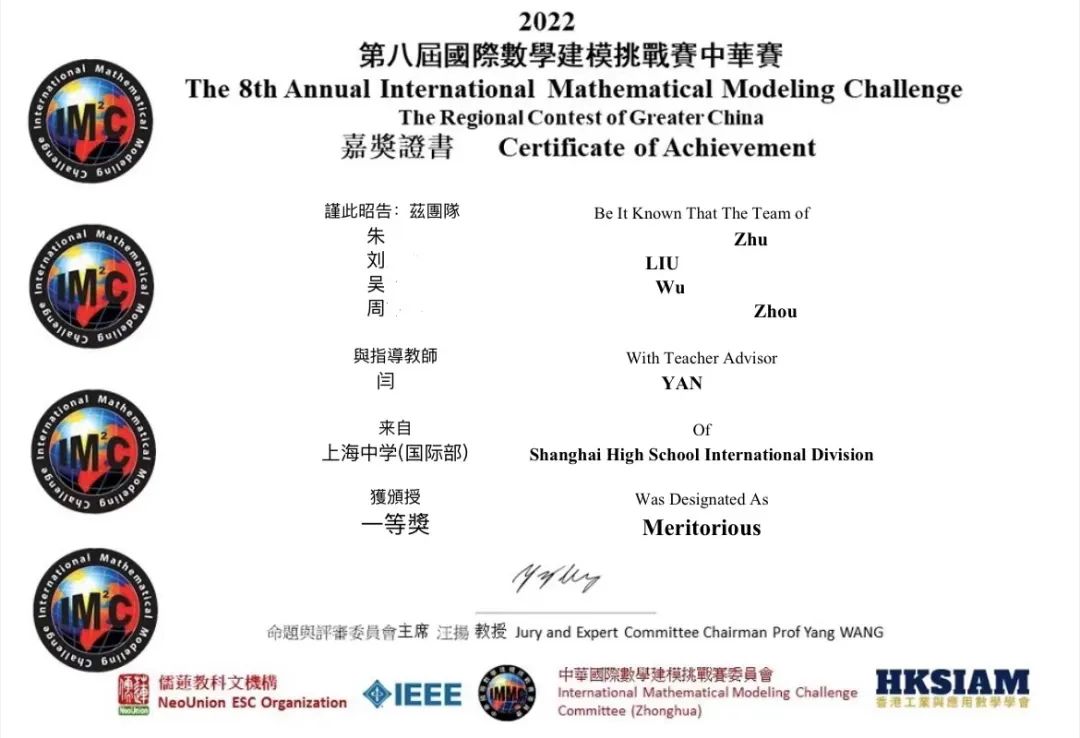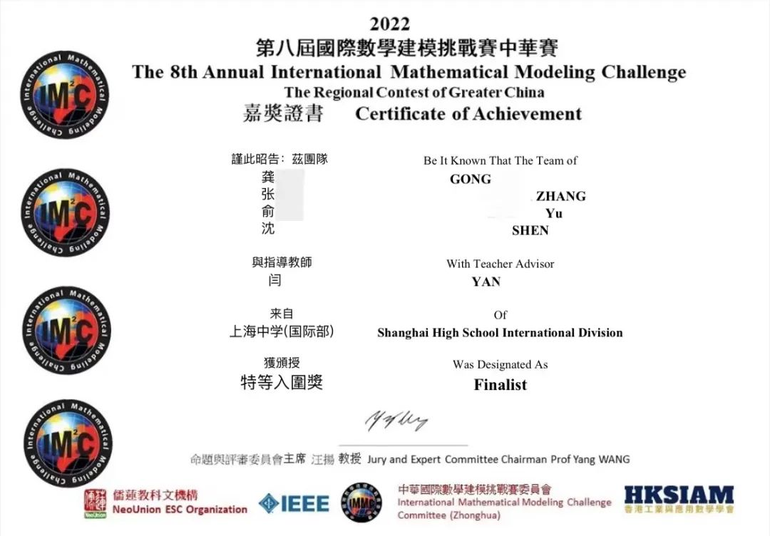 上海中学国际部第八届国际数学建模挑战赛中华赛IMMC2022喜报
