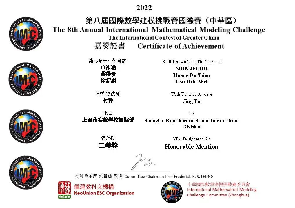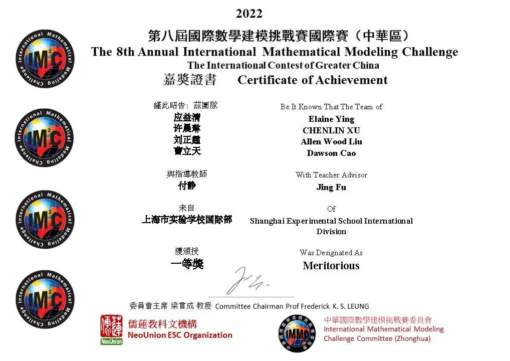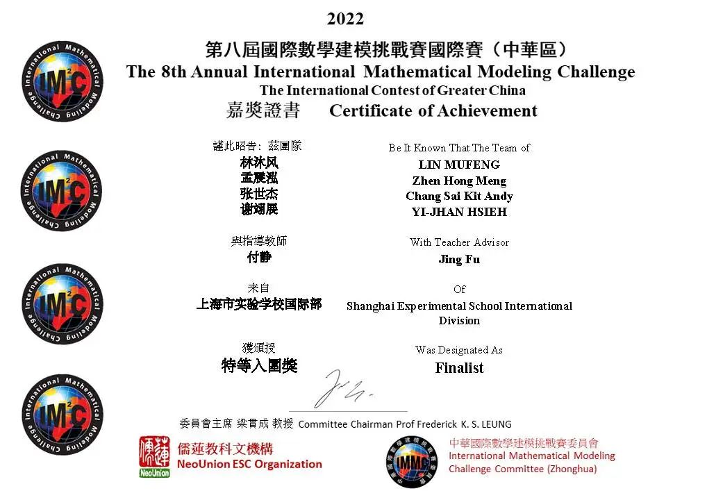 近日,国际数学建模挑战赛IMMC公布了2022年国际赛和中华赛的成绩,我校数学建模社的3支团队荣获佳绩。在中华赛中,国际部的3支队伍分别获得了一个特等奖以及两个特等入围奖。在国际赛中,这3支队伍分别获得了特等入围奖,一等奖,和二等奖。这是国际部第二次参加IMMC数学建模比赛,也是国际部数学建模社创立后的第一次比赛。同学们在比赛上展现了自己的实力,并为校争光。