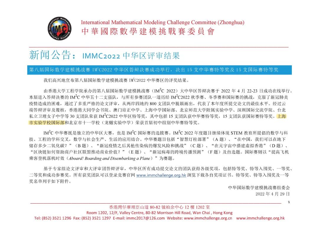 (一) 由于各方面情况的调整与变化,本网所提供的【上海市实验学校国际部学子在国际数学建模挑战赛IMMC中斩获佳绩 】仅供参考,并不意味赞同其观点或证实其内容的真实性,相关信息敬请以权威部门公布的信息为准。
