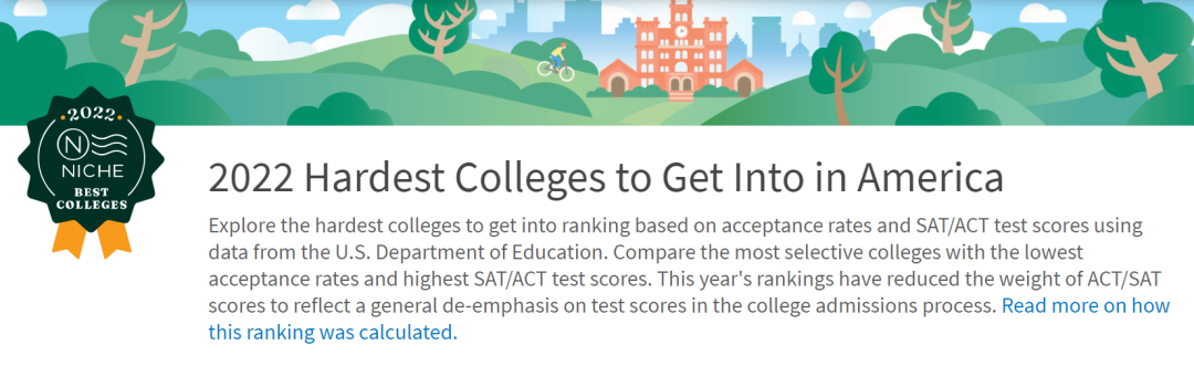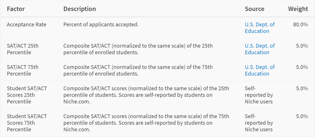 本次Niche排名主要基于美国各大高校公布的最新录取率、SAT/ACT考试成绩,以及美国教育部的数据统计而成。在今年的排名中,Niche降低了ACT/SAT分数的权重,以应对美国大学在录取过程中普遍不再重视考试分数的变化,同时把录取率的权重从60%升至80%!