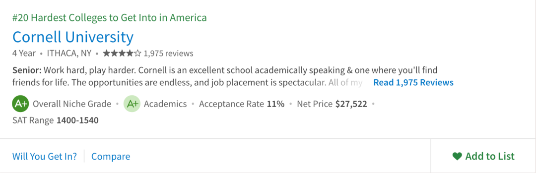 Niche 发布2022美国最难申请大学排名,藤校中康奈尔最容易录取...