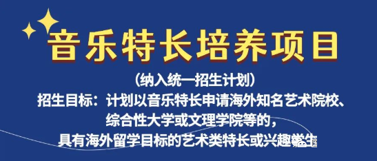自2022年,北京一零一中国际部联合北京一零一中金帆交响乐团、北京一零一中教育集团民乐团、美国ACES艺术教育中心对具备一定音乐特长、目标海外留学的学生开展四方联合培养工作。学生在北京一零一中国际部完成三年高中课程学习,同时在金帆交响乐团、民乐团、美国ACES艺术教育中心组建的音乐专家团队指导下开展专业课学习与训练。在专属音乐特长海外升学指导规划下,申请国外音乐类艺术院校,或以音乐特长申请国外综合性大学或文理学院。
