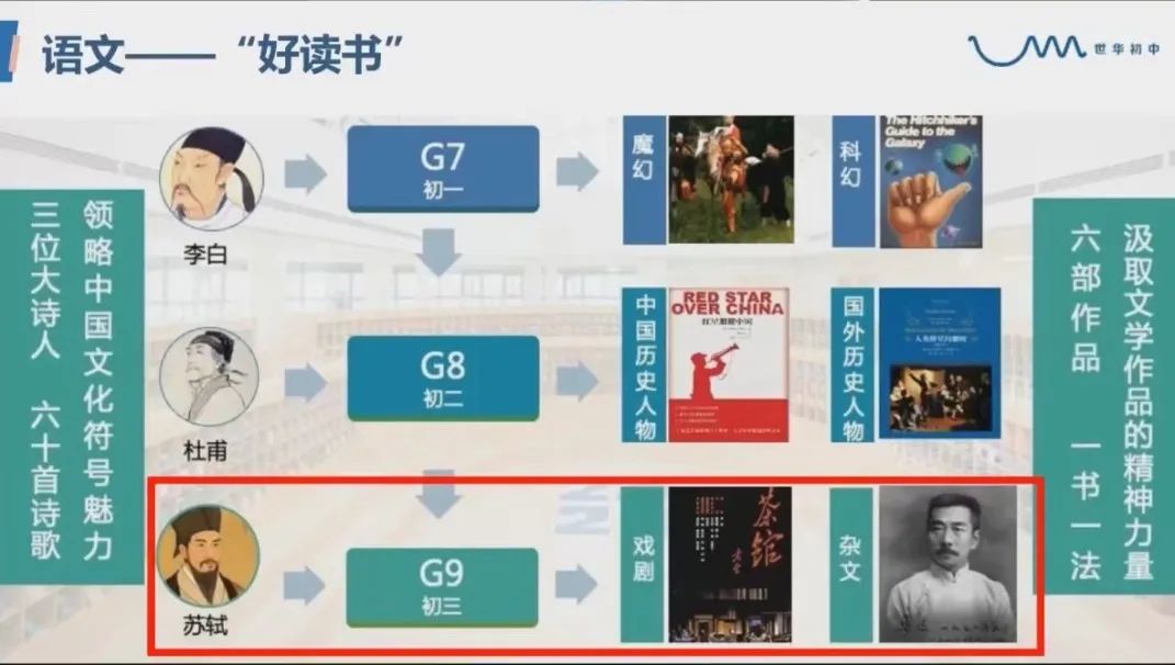 语文:9年级上学期中英文戏剧进行跨学科学习;9年级下学期学习鲁迅的杂文,情感表达和逻辑思考的浸润。