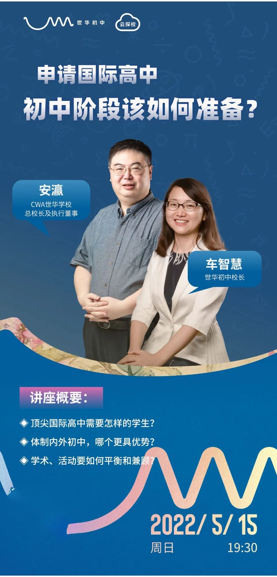 5月15日,世华初中将带来校长级重磅讲座,两位校长将结合多年教学育人经验,分享学生初中阶段申请国际高中的诀窍,机会非常难得!请各位家长速度扫描下方二维码预约,或点击文末“阅读原文”填写活动报名表!