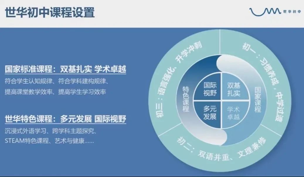 世华初中课程以国家课程为主,辅以特色课程激发学生的学习兴趣,拓宽国际视野,从而促进多元发展。