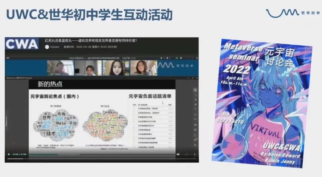 比如近期世华初中与常熟UWC学生之间进行的“元宇宙”研讨会,深入探讨了虚拟世界与现实世界的种种问题,对世界问题的讨论颇有见地。