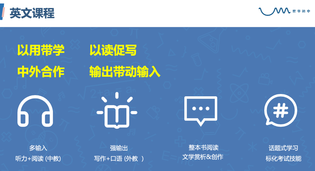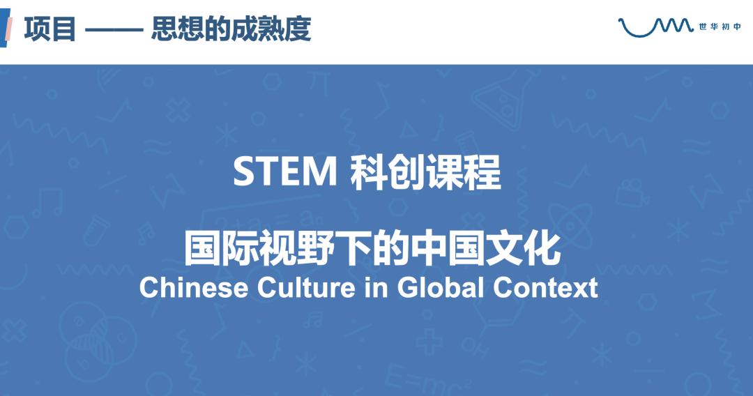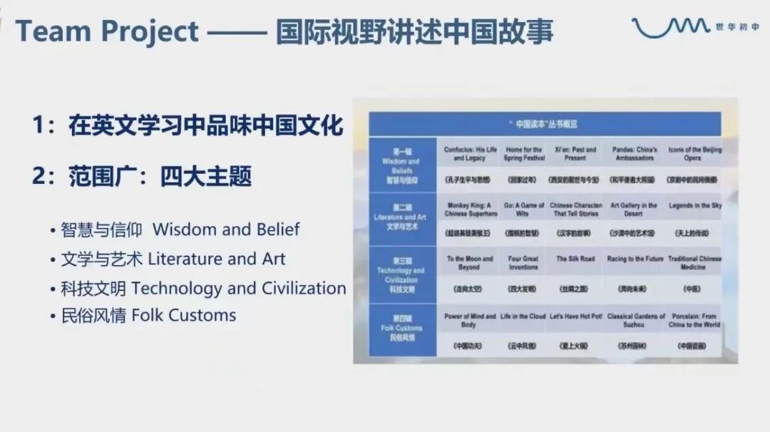 作为一所具有中国特色的学校,世华初中希望学生能通过民族维度、其他国家理解的维度,英文输入,中文输出。同时涉及智慧与信仰、文学与艺术、科技文明、民俗风情四大主题。