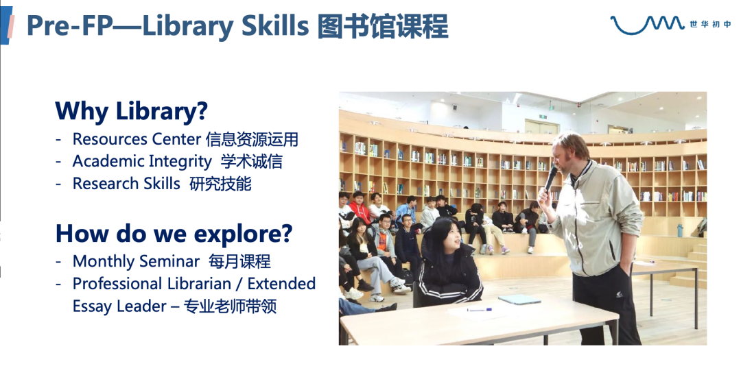 世华初中特派曾作为专业图书管理员,同时也是高中拓展论文的协调员的加拿大外籍老师主讲图书馆课程,为学生专业授课,在初中就掌握信息资源运用能力。