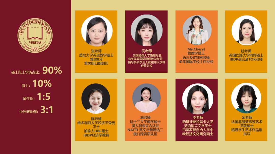 美达菲的教师团队专业素质高,获得博士学历的教师占10%,硕士学历占90%,中外教比3:1,师生比1:5,教师团队平均教龄7年,平均在美达菲执教3年,培养的学生100%获得世界前100大学录取。名师教研教学团队保证了“学术第一,全面发展”。