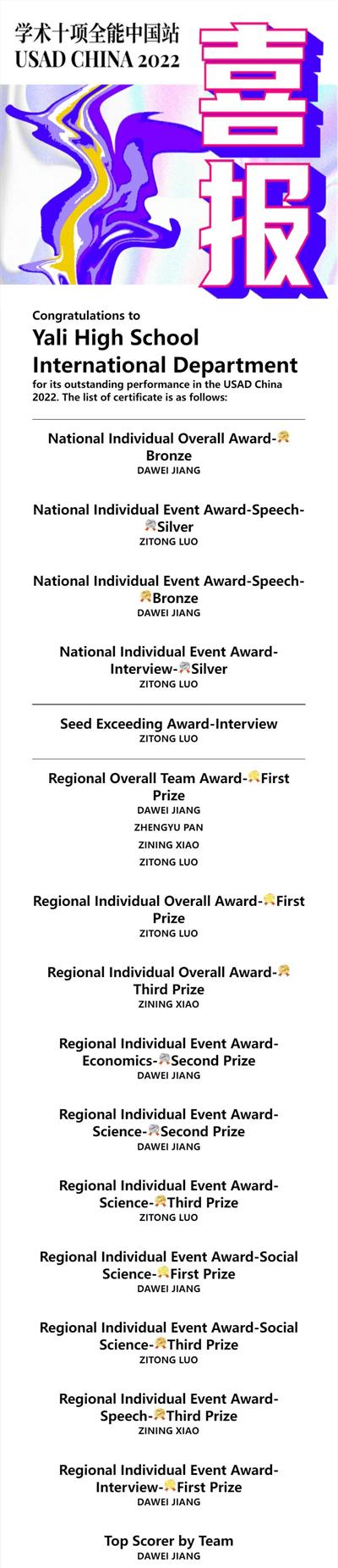 长沙雅礼中学国际部同学在2022年美国学术十项全能赛USAD中国站中获得如下佳绩:
